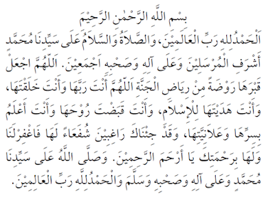 Artinya; “Segala Puji bagi Allah, Tuhan Pentadbir seluruh alam. Rahmat dan kesejahteraan ke atas junjungan kami Nabi Muhammad ﷺ, penghulu semua Rasul dan juga ke atas keluarga dan para sahabat Baginda seluruhnya. Ya Allah! Jadikanlah kubur si mati ini sebagai sebuah taman daripada taman-taman syurga.
